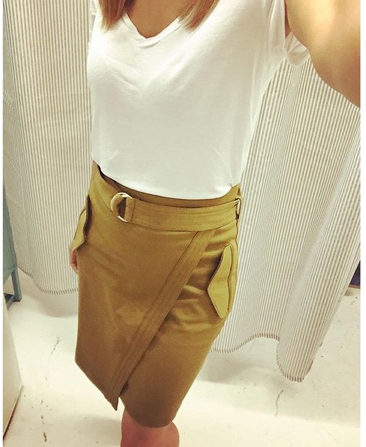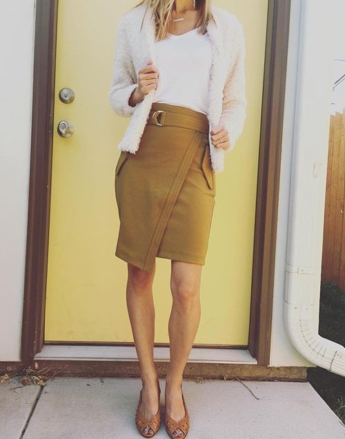 A wrap skirt is an easy piece to match with different styles. I love a basic white T with it and then just accessories. Casual or dressy, you decide!
