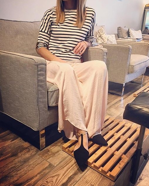 Gold glittery palazzo pants and striped sweater is what I imagine myself wearing in St. Tropez. Only that I am in a mountainous, landlocked place but who cares?