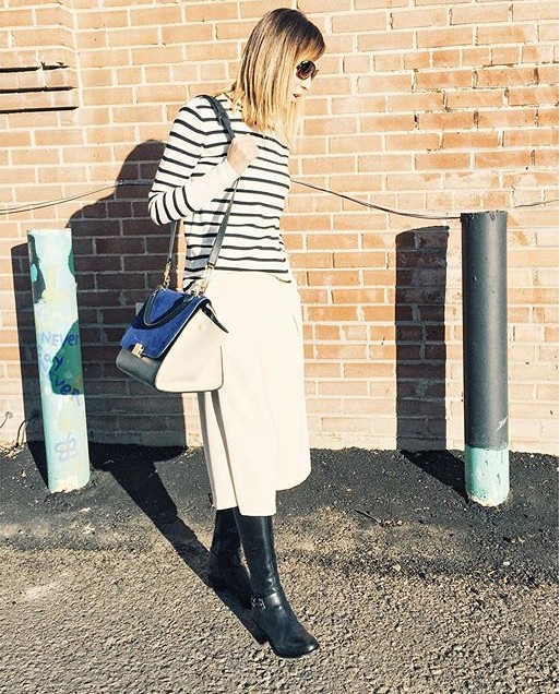 Jcrew sweater + tan culottes + riding boots + Celine bag
