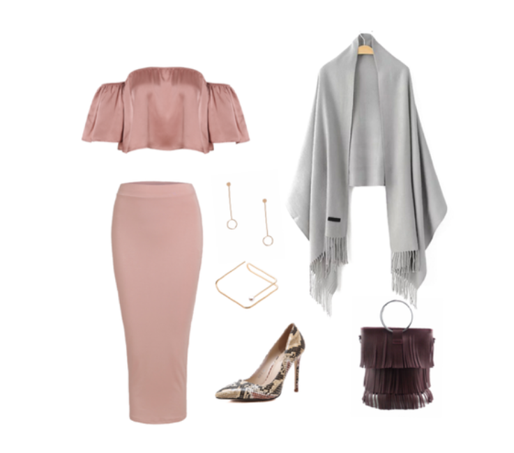 So much going on here that I love: pencil skirt, blush, snakeskin, fringe and geometric details! The whole outfit rings in at $100