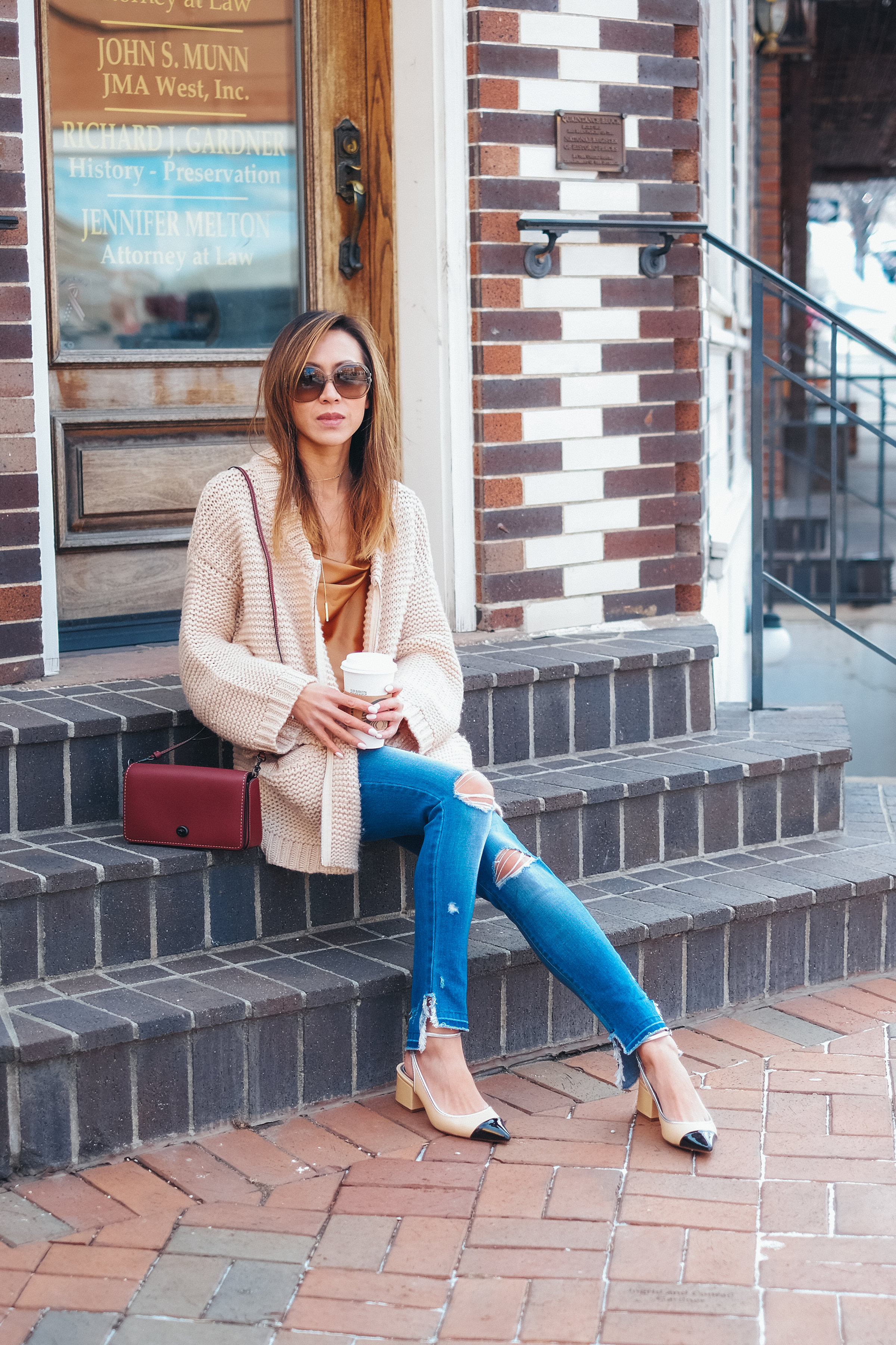 In this outfit, I mixed a shiny copper satin top with the coziest chunky knit – both pieces from Shine here in Denver. Shine is trendy little Boutique in the Washington Park neighborhood. They take a different approach to shopping for clothing by dumping conventional sizing norms. The size tags are all cut out and instead you will find a color coded directory that lets you know how you should pick a fit. Black, I believe was sexy which you can imagine will be a tighter fit. There are colors for casual or comfortable, too. Kinda cool, eh?