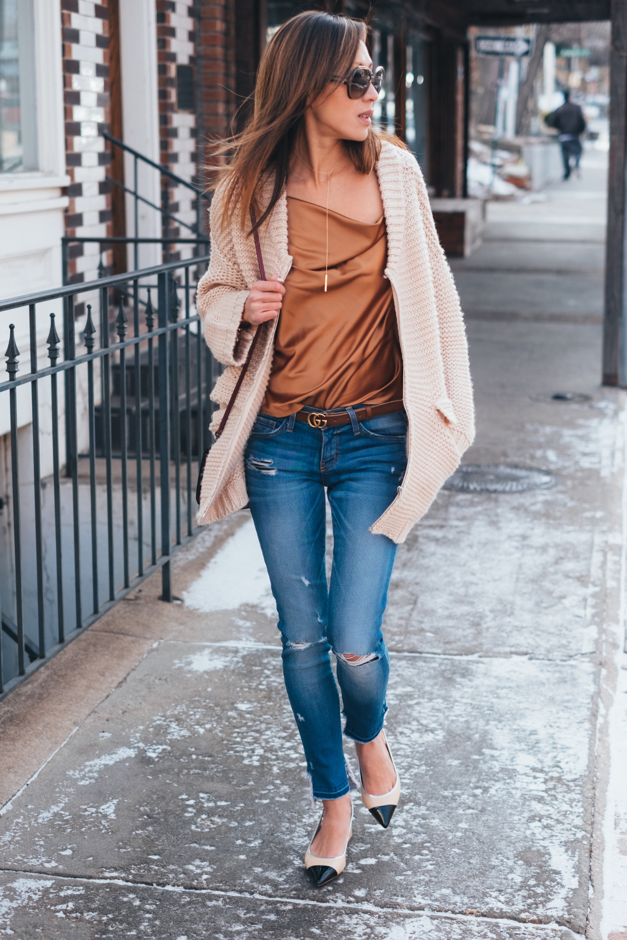 The Groundhog has predicted 6 more weeks of winter, yuck! Although it has been freezing cold this month, there have been some nice and warm stretches of sunny days. And when that happens, the fun transitional outfits come out to play. To me that means layering dainty tops with oversized covers. Generally, I love mixing different materials for an interesting, eye catching effect. Oversized coats and jackets is what I live in anyway. I feel the need to throw an oversized cover over form fitting outfits to tone down the look and to feel like I am wrapped in a big cozy blanket. Maybe there is a Linus in me that needs to drag a security blanket around everywhere lol!