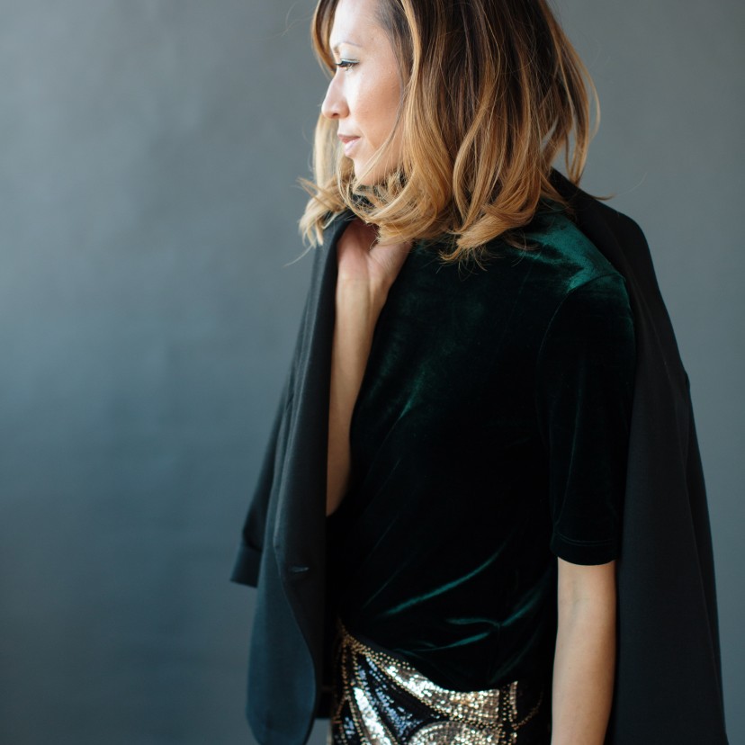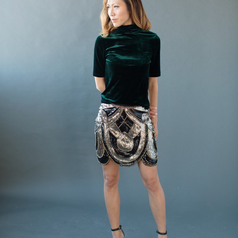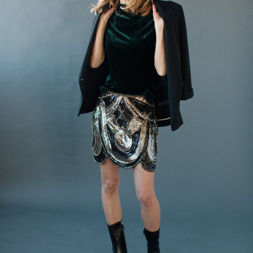 My velvet crush continues. If you are running out of time to find the perfect party dress, try wearing separates. In this two piece combination I paired a midi sleeved, cropped, velvet shirt over a short glittery skirt. I love