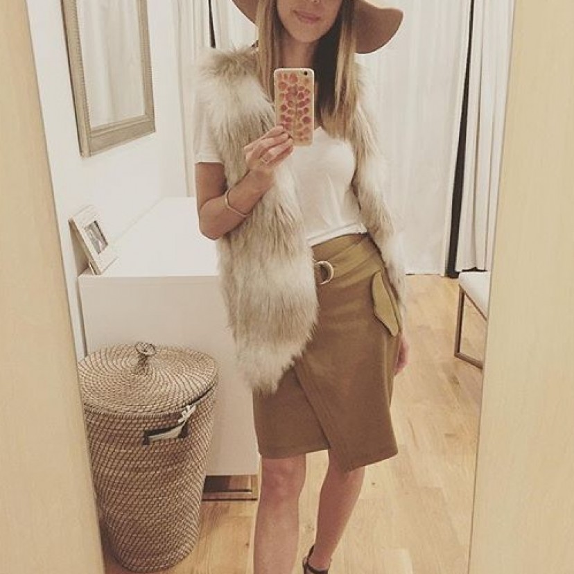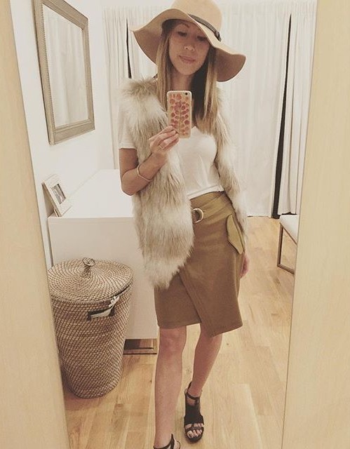 A wrap skirt is an easy piece to match with different styles. I love a basic white T with it and then just accessories. Casual or dressy, you decide! Comfy chic with fluffy jacket + tan cutout peeptoes Dress it