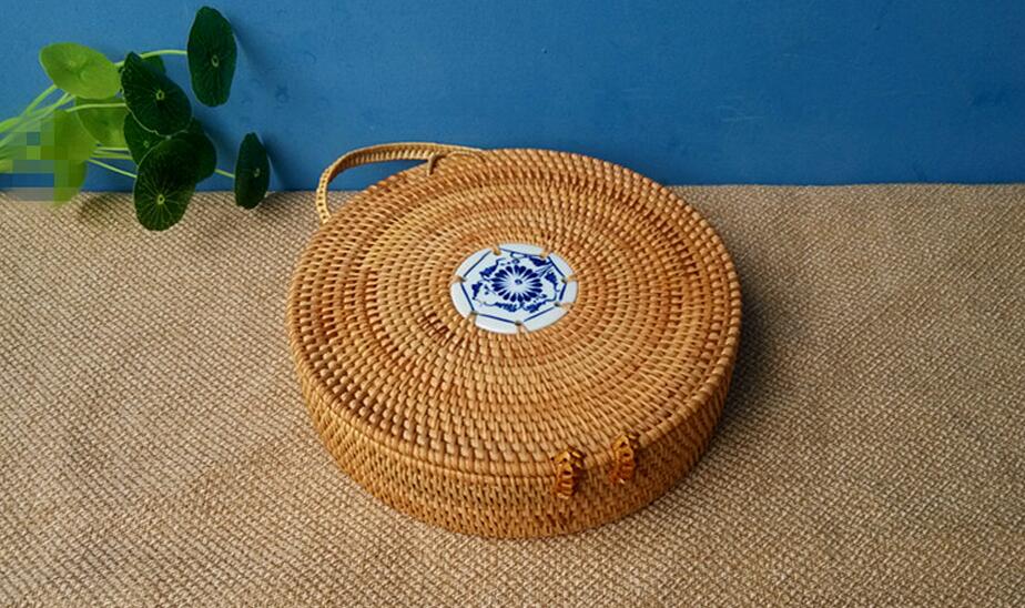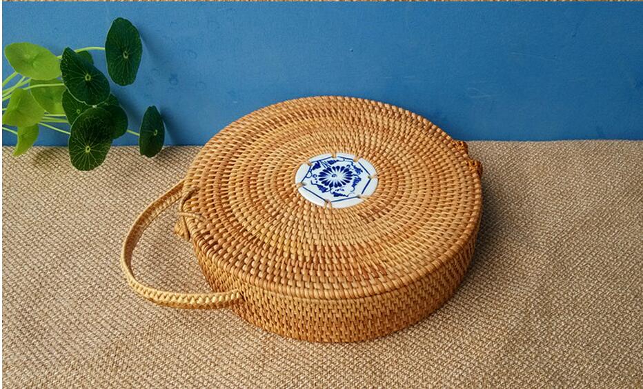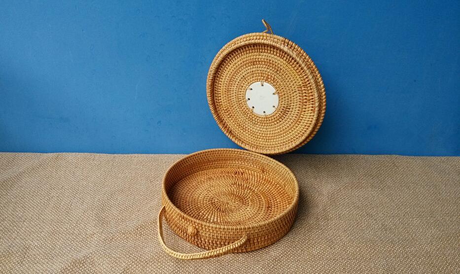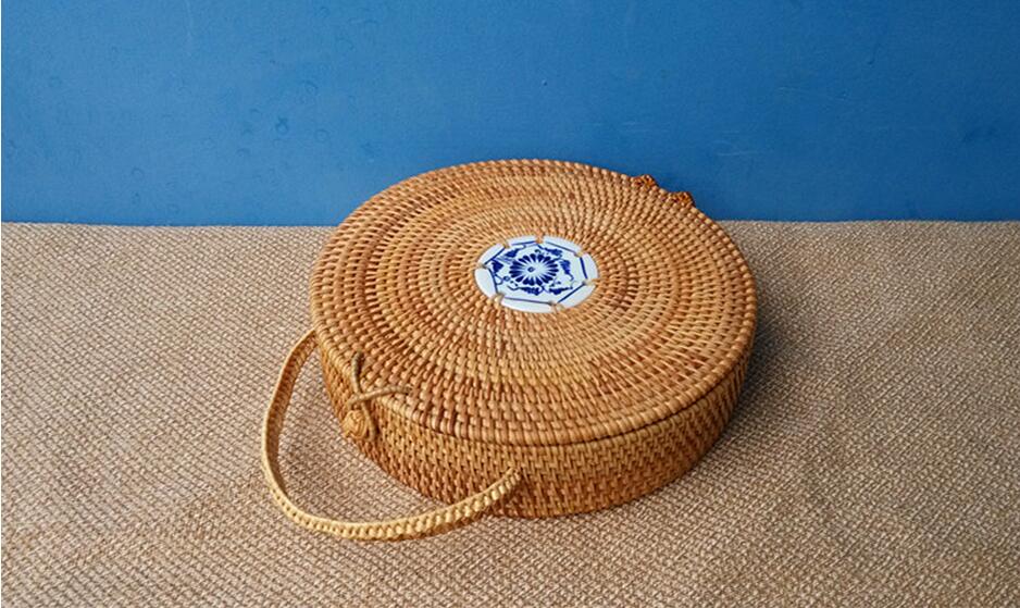 I love this mini round bag. It’s handwoven from rattan with a delicate porcelain ornament in the center. It has cute top handles and the lid seals with a simple twist. It’s the perfect accessory for the beach or a night out in town.